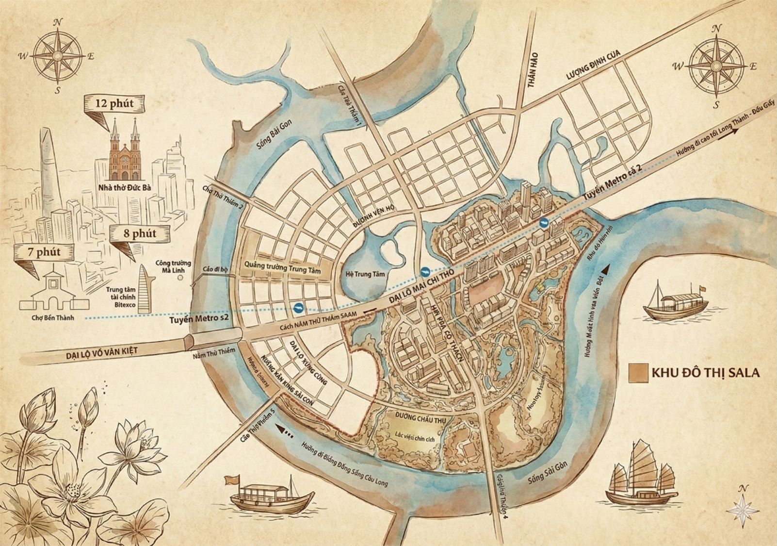 - 5 phút: Đến Quận 1 thông qua hầm Thủ Thiêm hoặc cầu Ba Son, kết nối ngay các trục đường trọng điểm như Nguyễn Huệ, Đồng Khởi, Lê Duẩn.