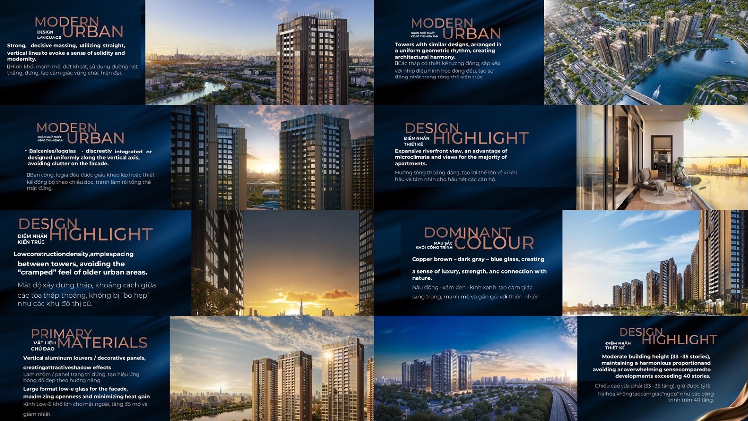 Toàn bộ dự án mang phong cách Modern Urban, với các hình khối vuông vức, dứt khoát và hiện đại.